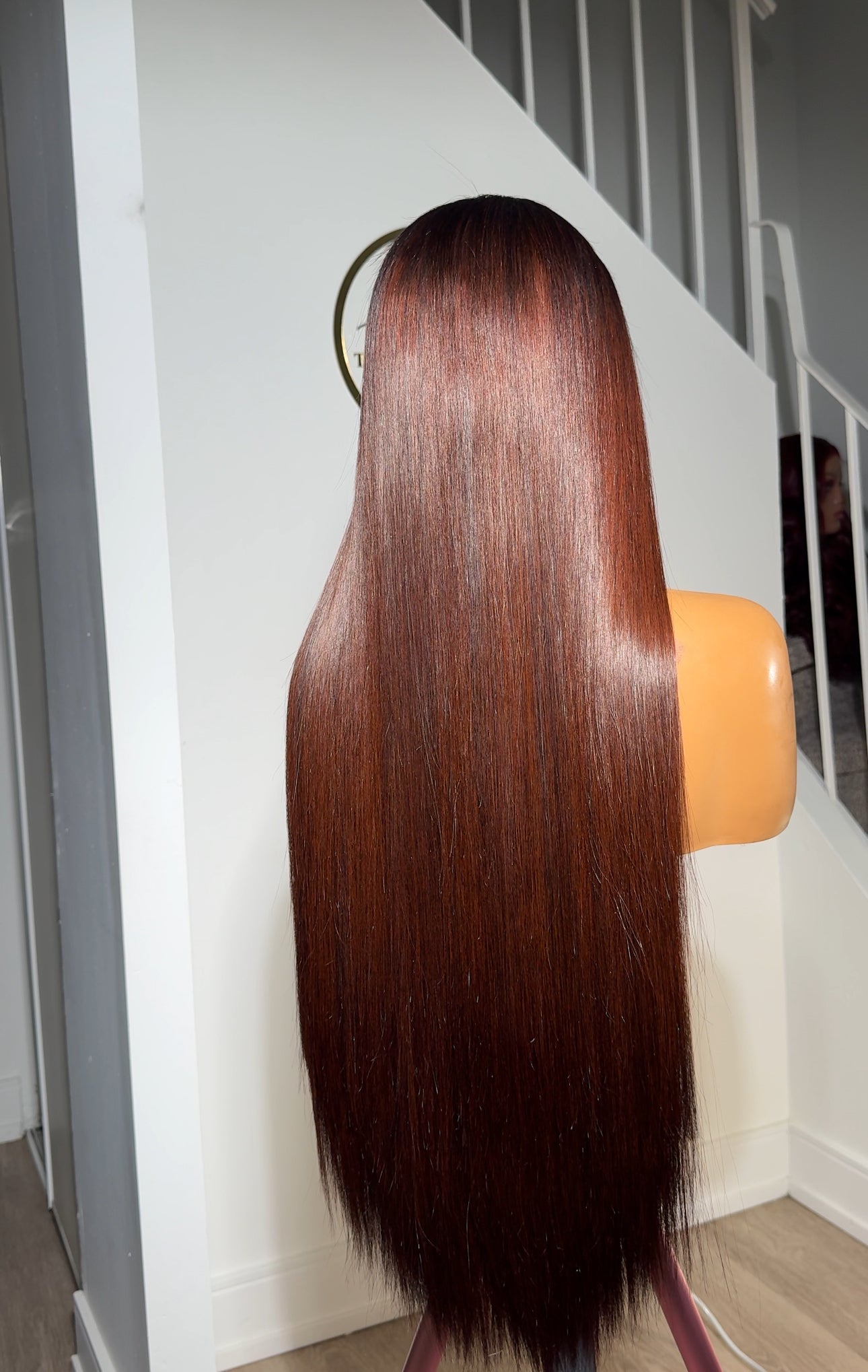 This is a sleek, bone-straight wig and features a 5x5 HD closure with 3 bundles, crafted using sewing machines to fit head sizes 21 inches to 23 inches. Please allow 2-4 business weeks for processing before shipping.